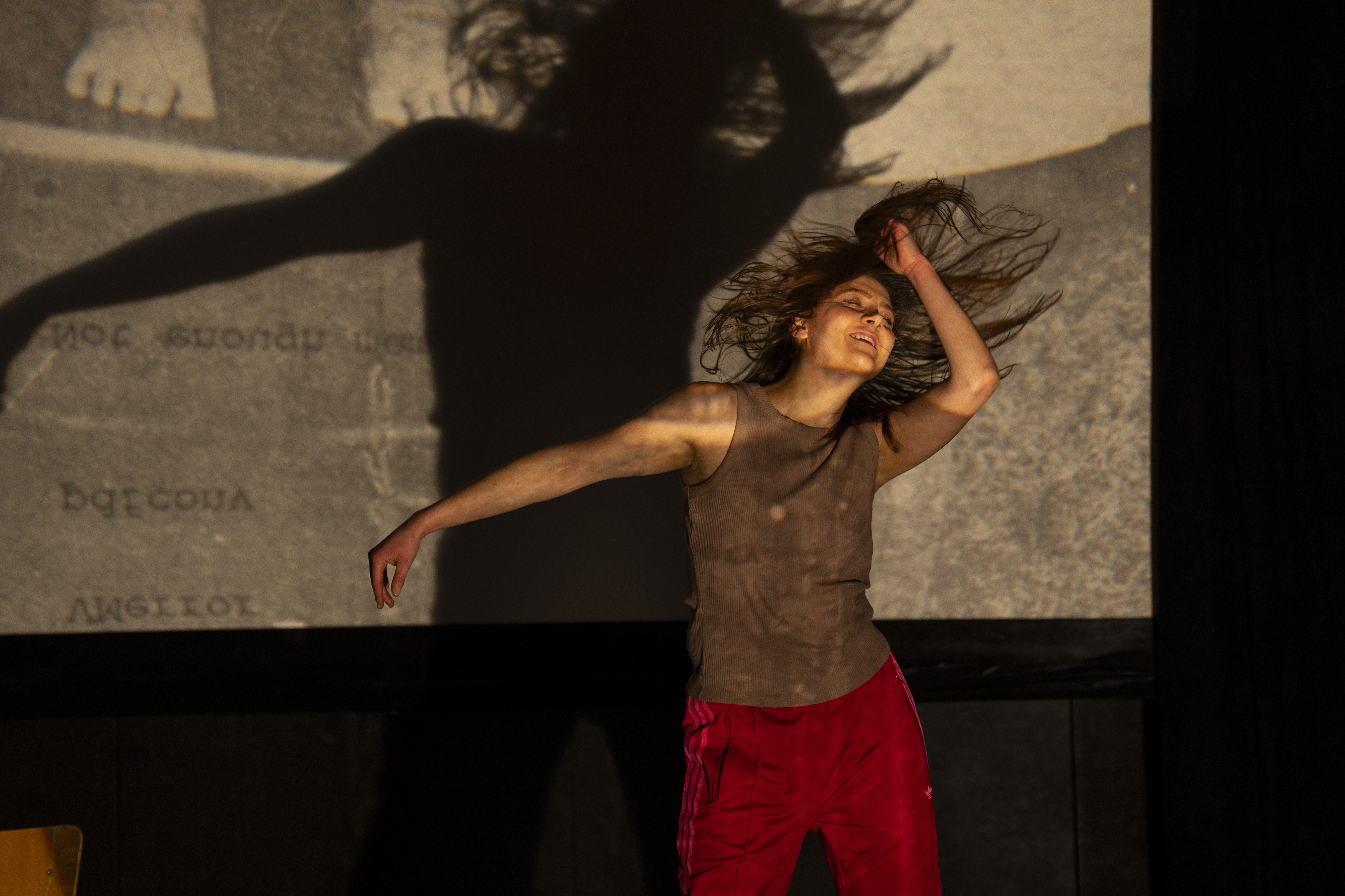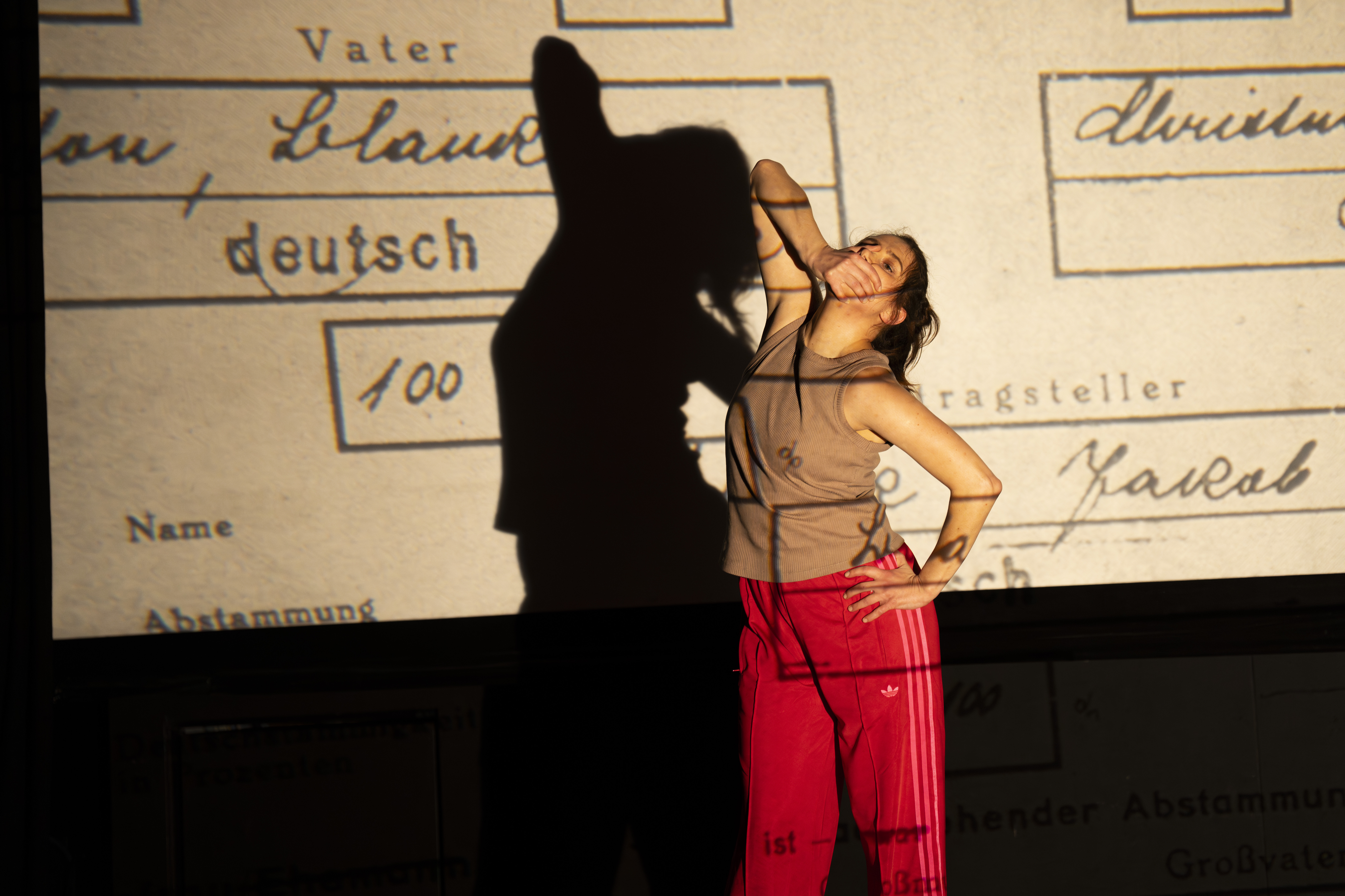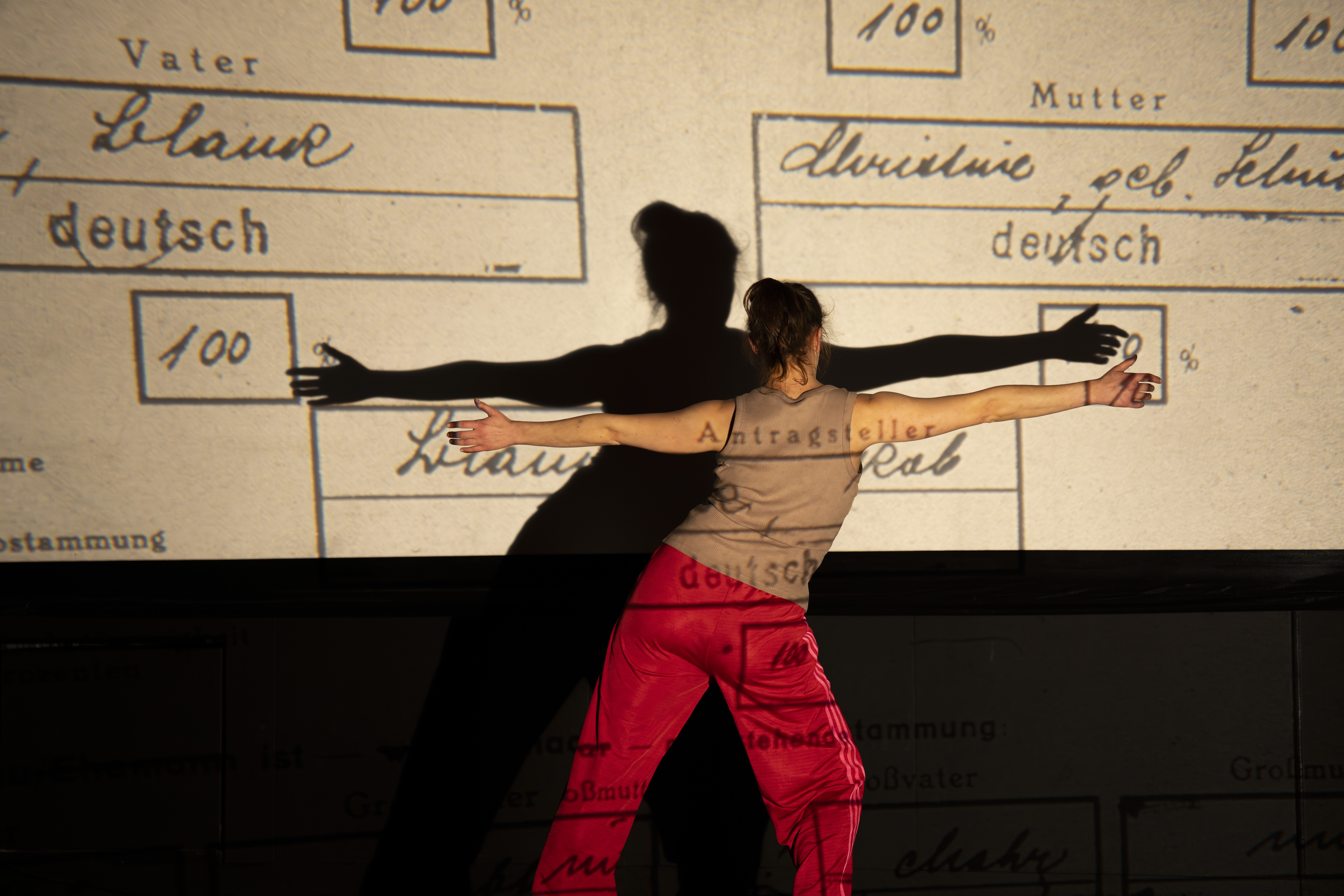 In ihrer interdisziplinären Solo-Performance setzt sich Olga Blank mit ihren Erinnerungen an das Ankommen und Aufwachsen in Deutschland auseinander. Im Zusammenspiel von Sprache, Bewegung und Projektionen entsteht ein vielschichtiges Bild der Lebensrealität einer mitgebrachten Generation und ihres Ringens um Zugehörigkeit.