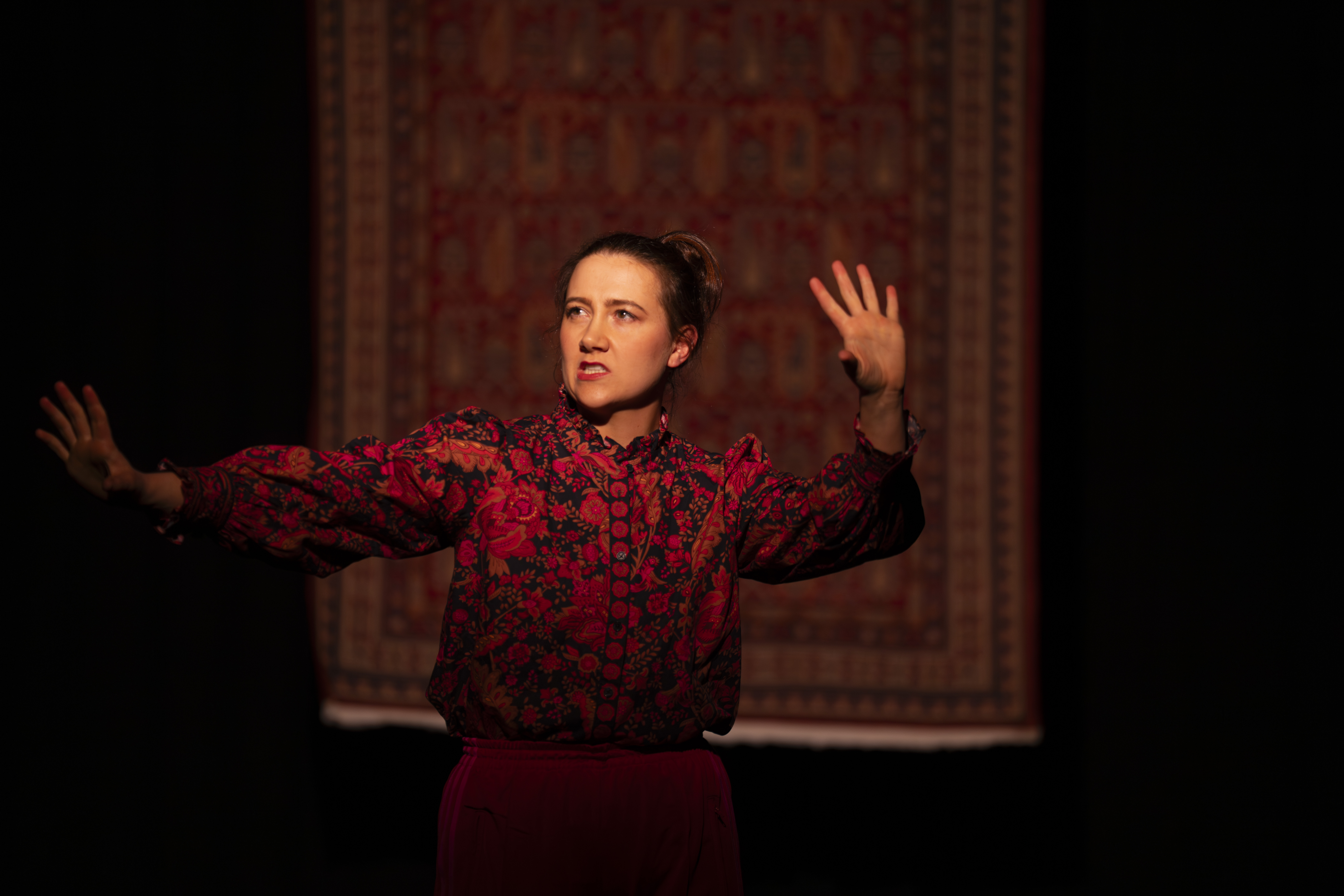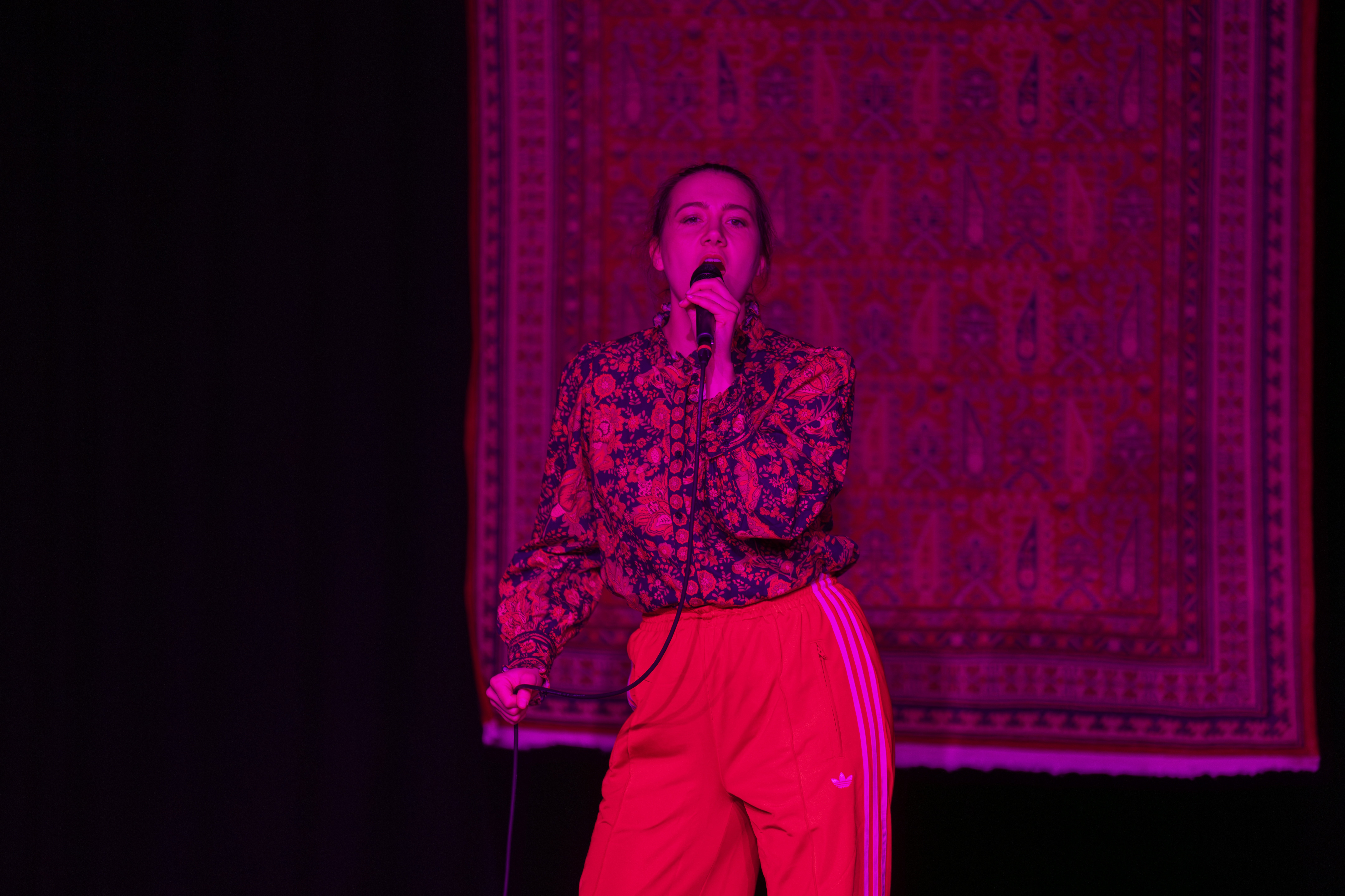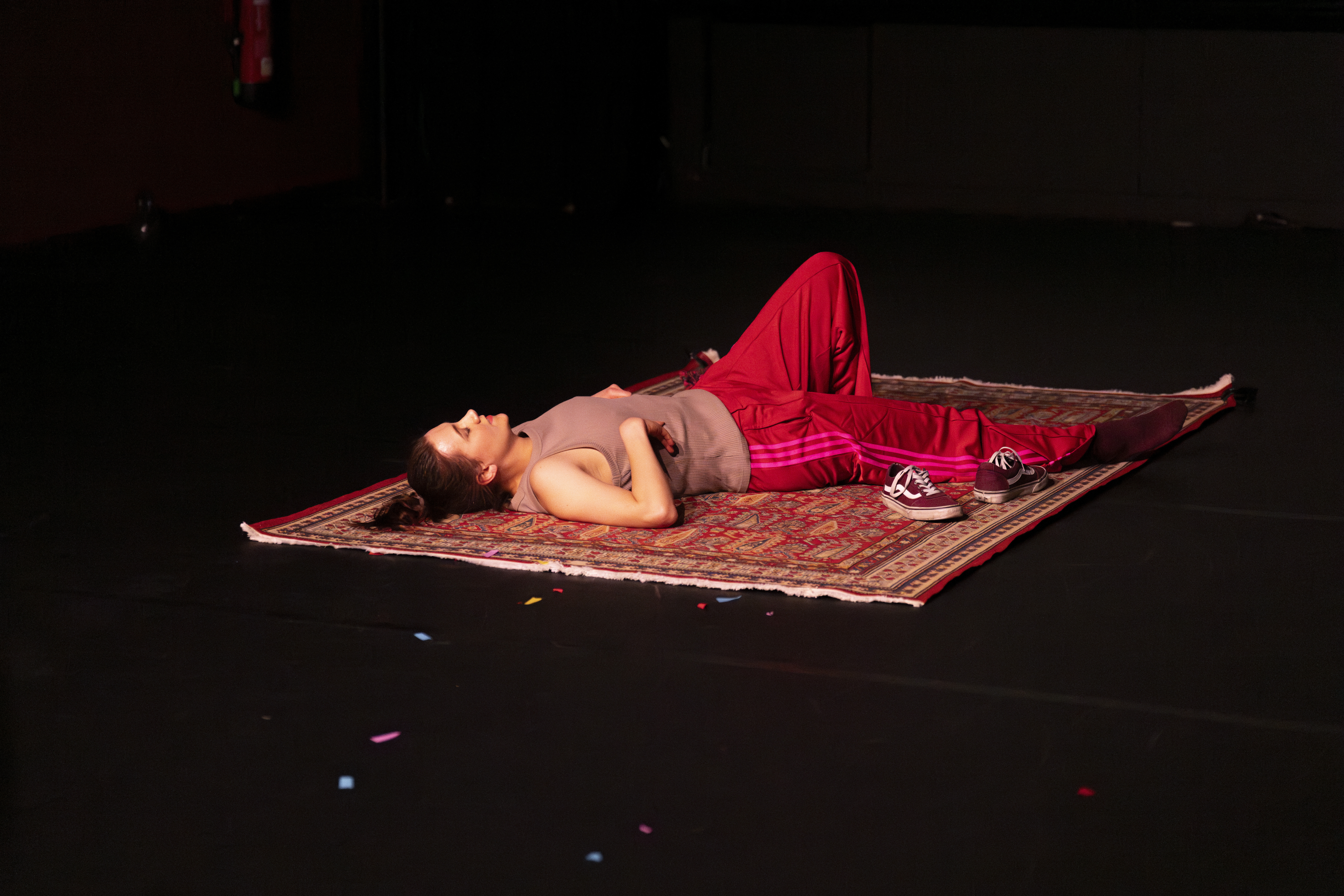 In ihrer interdisziplinären Solo-Performance setzt sich Olga Blank mit ihren Erinnerungen an das Ankommen und Aufwachsen in Deutschland auseinander. Im Zusammenspiel von Sprache, Bewegung und Projektionen entsteht ein vielschichtiges Bild der Lebensrealität einer mitgebrachten Generation und ihres Ringens um Zugehörigkeit.